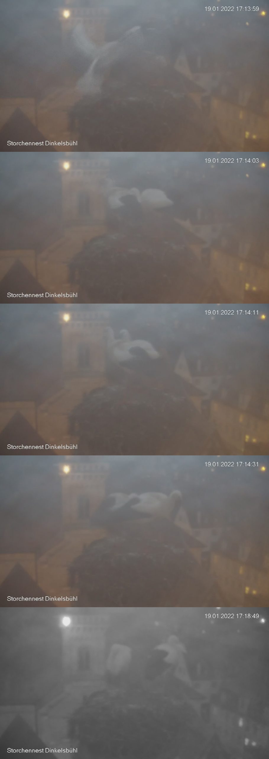Da der Ablauf im Nest derzeit ohnehin recht unspektakulär abläuft (früher Aufbruch des Storchenpaars und Rückkehr in der Dämmerung zur Übernachtung) und der direkte Zugriff auf die Kamera mit großem Aufwand verbunden ist (Einsatz der Feuerwehrautos mit der großen Leiter) wird eine Behebung des Problems auf den ausgehenden Winter, also etwa Ende Februar, verschoben.