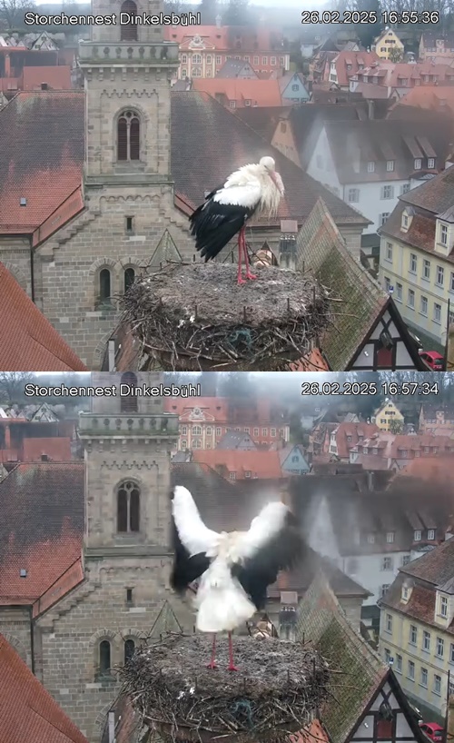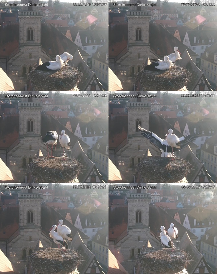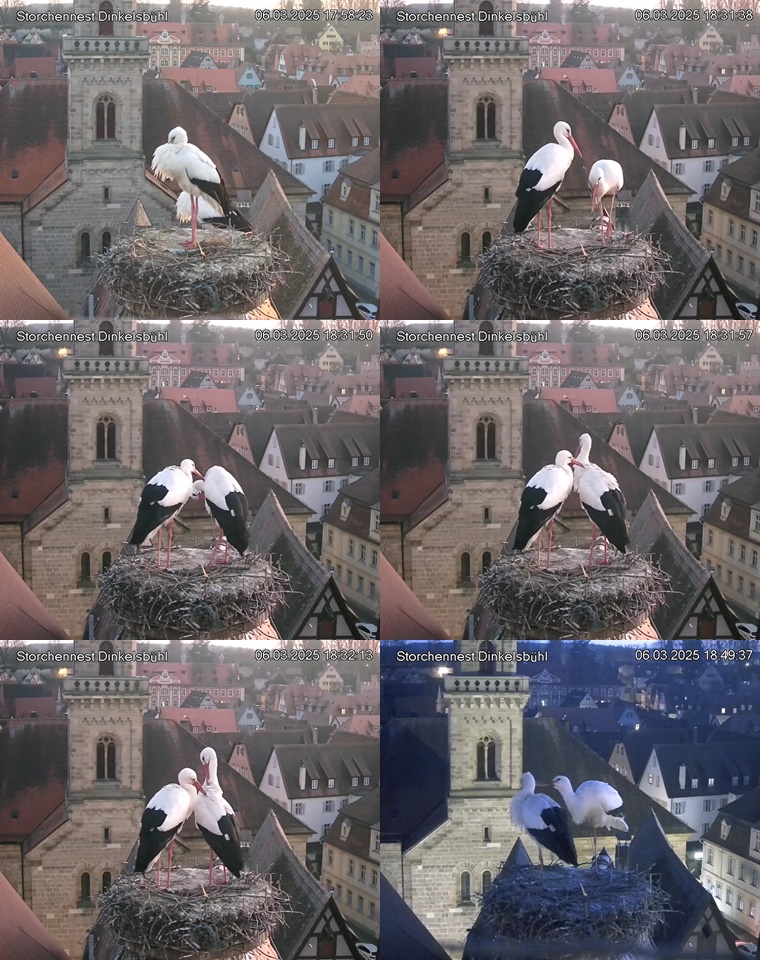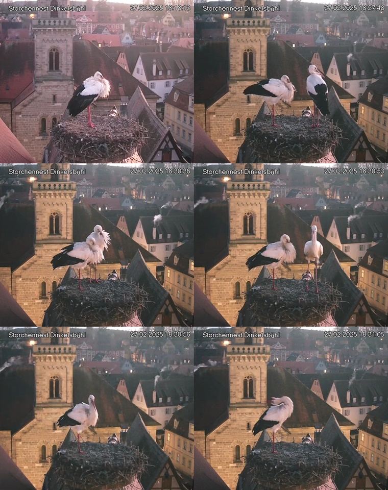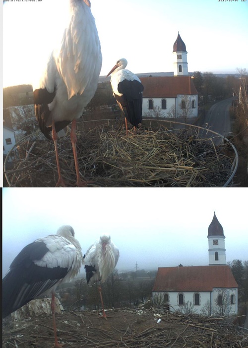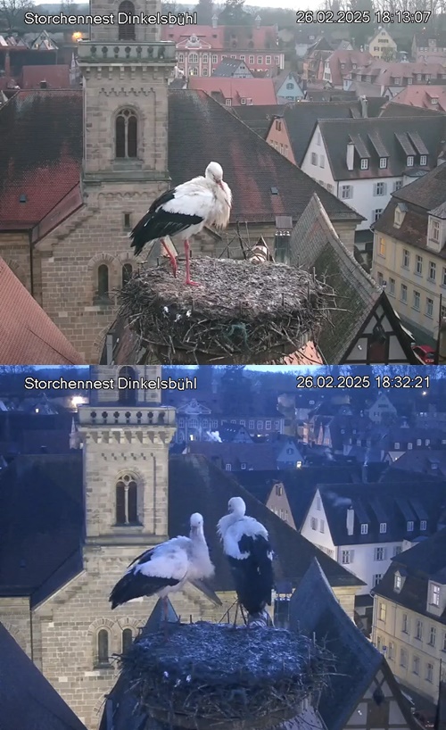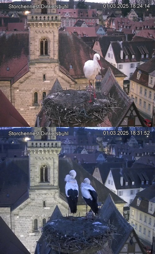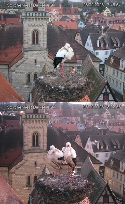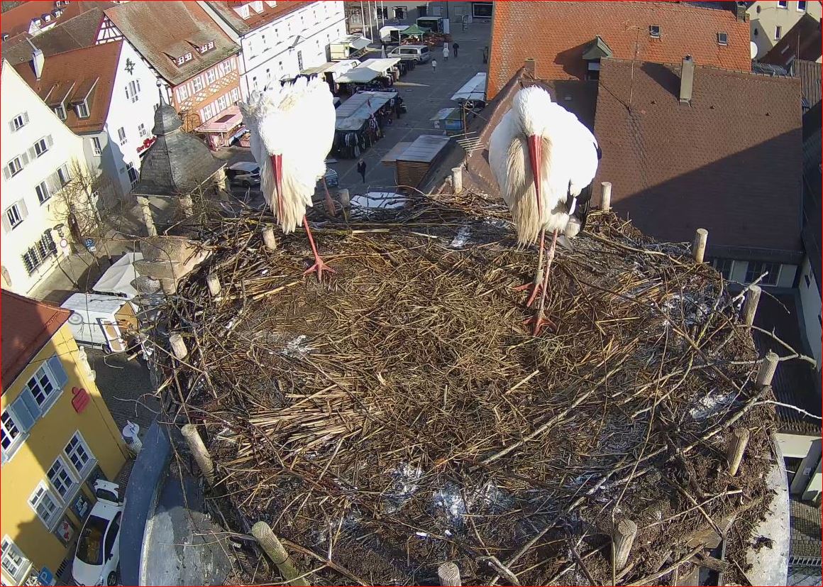 1. Im Nest an der Kamera stehen auch zwei Störche. Nest Nördlingertor und Nest Wörnitztor wurden ja vor Weihnachten entfernt. Doch beide paare fangen wieder an zu bauen..😄