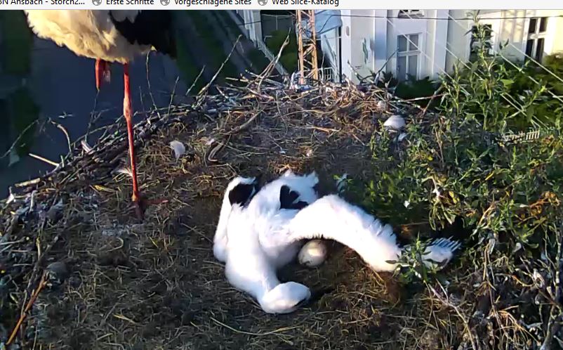 Die Kleinen in Mengen, in Meßkirch nur einer da, Neupotz, Neustadt an der Aisch, Neustadt an der Waldnaab, Schwarmstedt, Schönfließ an Bord, in Erlangen dürften es die Eltern sein, komplett in Tirschenreuth, Weiden, Winsen, Wolfsburg und Zusenhofen. In Leiferde steht ein Altstorch im Nest: