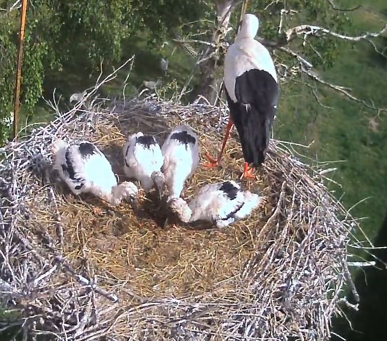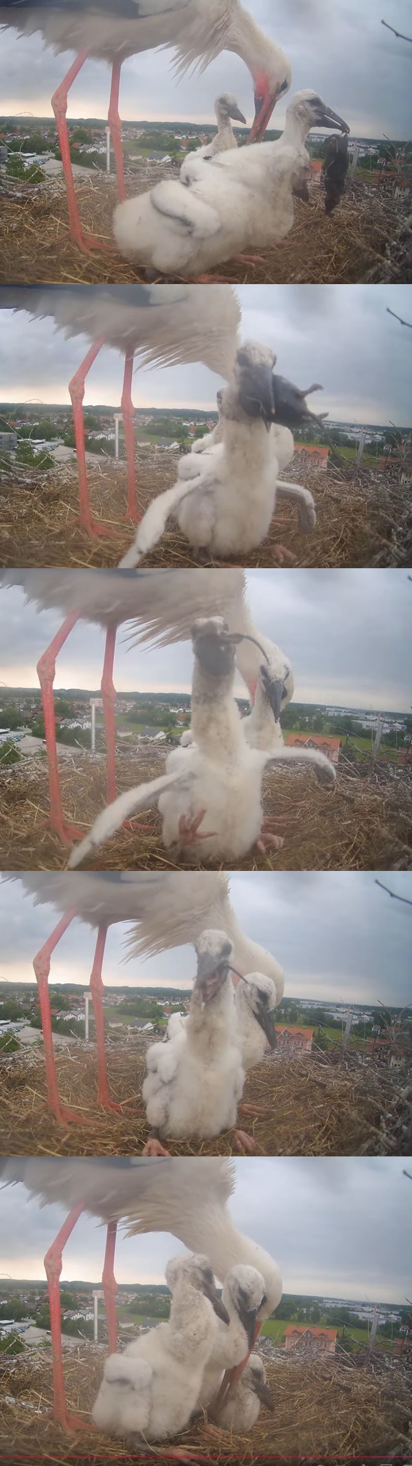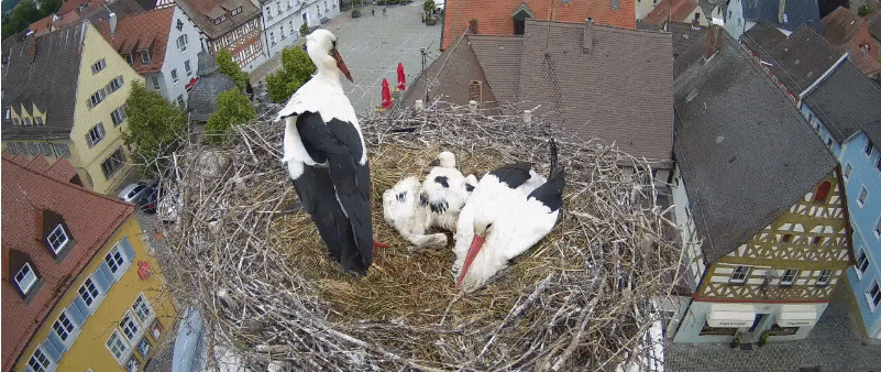 Das Kleinste in Freilassing ist leider in der Nacht verstorben und wurde heute früh um 05.15 Uhr vom Altstorch aus dem Nest geworfen. 🙁